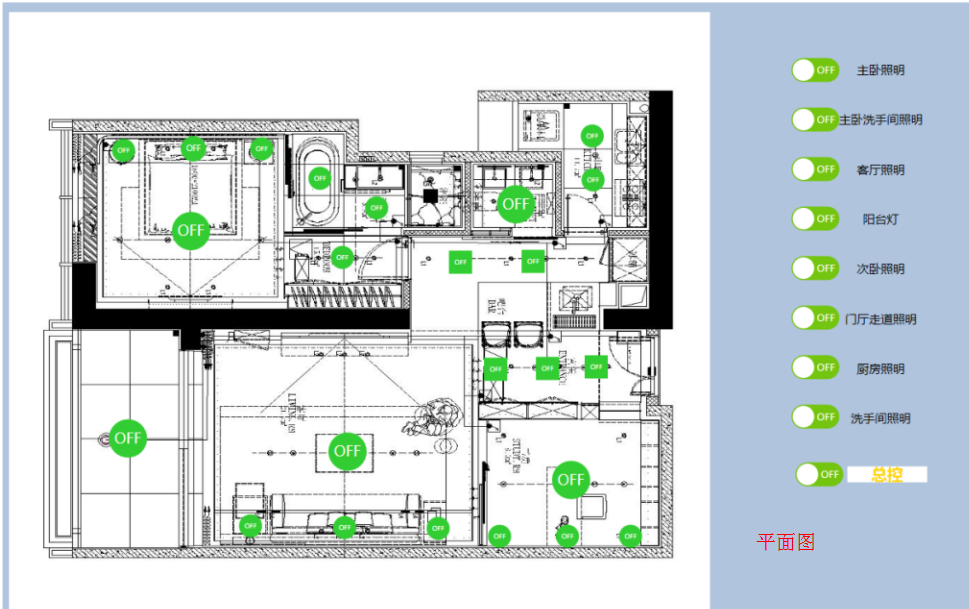 可以通过电脑或者触控终端控制一栋楼、某一层或某个区域所有照明灯具开关。可以对单个照明回路实现开关控制,还可对每个模块、箱子、楼层、自定义分区实现总控。现场受控回路的开关状态会实时反馈。