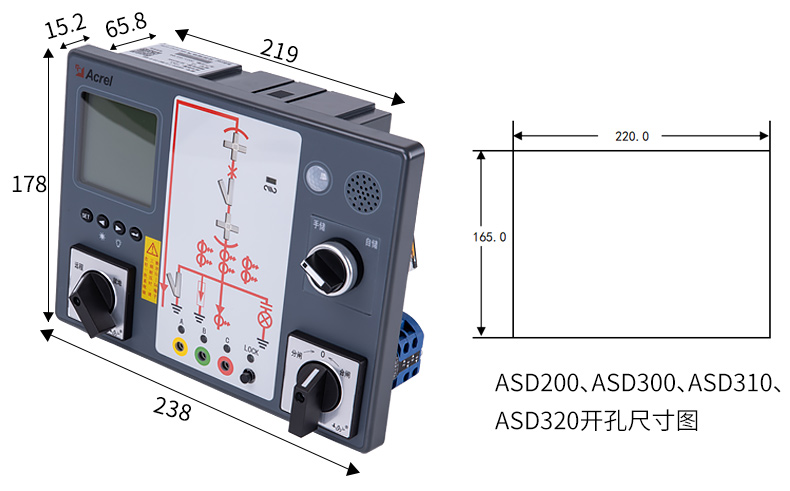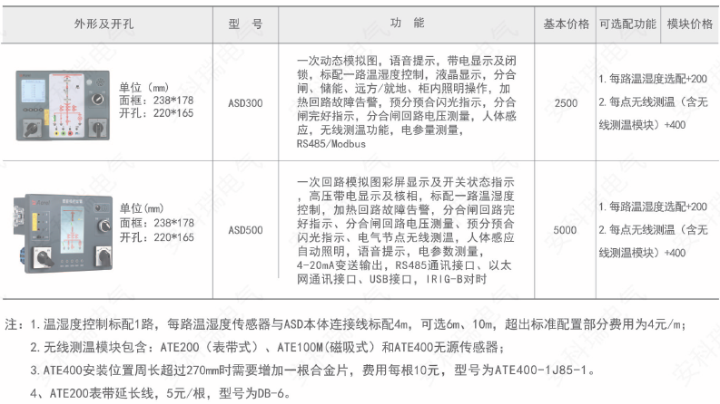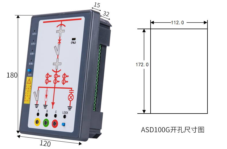 ASD系列开关柜综合测控装置具有一次回路模拟图及开关状态指示、高压带电显示、自动温湿度控制、人体感应自动照明、语音提示、电参数测量及RS485通讯接口等功能,集操作、显示于一体,直观地体现柜内元件的工作状态及工作环境。