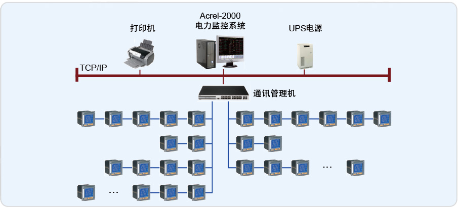 采用Acrel-3000电能管理系统实现远程电参量(电流,电压,功率,功率因素等)实时监测与分类电能计量。以现场测得的最大需量(MD)与系统预先设定的需量限定值进行比较,在超量时报警。监控系统主要分为3层:站控管理层(工控机、打印机、UPS电源)、通讯管理层(4口通讯管理机)、现场设备层(现场智能装置)。现场中的IO设备的通讯线缆采用RVSP 2*1.5屏蔽双绞线,连接至4口通讯管理机。选配ACR220EL/K的多功能仪表,具有 LCD液晶屏显示,可监测三相电流、三相电压、电网频率、三相(有功功 率、无功功率、功率因数)、三相有功电能、三相无功电能6项测量参数。