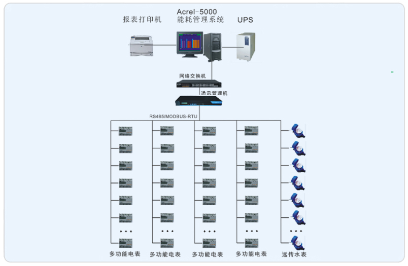 系统采用Acrel-5000型能耗检测系统,整个系统采用网络分布式结构,监控主机位于旋极科技大厦一楼机房内,现场电表在每个楼层的南北区内。水表分布在每层的男女厕所的竖井里。所有配电回路均配备安科瑞电力仪表DTSY系列及积成光电直读系列水表。该项目实现了旋极科技大厦主办公楼的能耗检测。所有监控设备均通过屏蔽双绞线至一楼的通讯管理机再通过网线连接到主机从而实现远程监控。