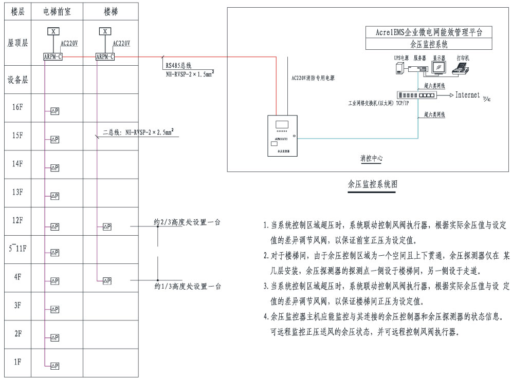 在建筑物内公共区域走道、封闭楼梯间、防烟楼梯间及其前室、消防电梯及其前室或合用前室等处设置余压探测器,用于检测相应区域两侧的压力差值;加压风机处设置余压控制器,当加压送风机启动后,控制器根据余压探测器超压/加压动作指令,控制泄压阀动作,确保上述区域的压差值满足规范要求;泄压阀处安装风阀执行器,用于将余压控制器输出的控制信号转换为执行动作,控制泄压的开关,实现加压送风系统的风量随系统调节,余压监控器安装在安防消防控制室。根据用户的需求,余压监控系统可以满足与AcrelEMS企业微电网管理云平台或电气火灾自动报警系统等进行数据交换和共享。