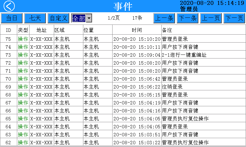 在该页面内可查询任意时段内的报警、故障、事件记录。点击“当日”按钮查询当日所有记录,点击“最近7天”按钮查询最近7天所有记录。点击“自定义”按钮可以选择时间范围内再进行查询