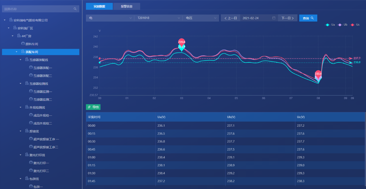 对企业各点位的能源使用、报警等情况进行实时的监控。以便企业用户能够实时的监测各个点位的运作情况,同时能更快速高效的掌握点位的报警,并为企业削峰填谷、调整负载等技改措施提供数据支撑。